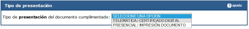 Presencial con impresión del documento. En el caso de que no quiera hacer la presentación electrónica indicada en el punto anterior, se deberá generar e imprimir el documento para su presentación por cualquier otra vía ante el órgano competente para tramitar la solicitud. Aviso: En este supuesto la generación del documento no efectúa la presentación del mismo.