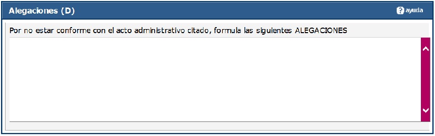 Se deben consignar las alegaciones tanto de sobre cuestiones de hecho como de derecho en las que fundamenta su recurso. En el caso de que el espacio sea insuficiente, se pueden incorporar nuevas alegaciones en documentos anejos al modelo.
